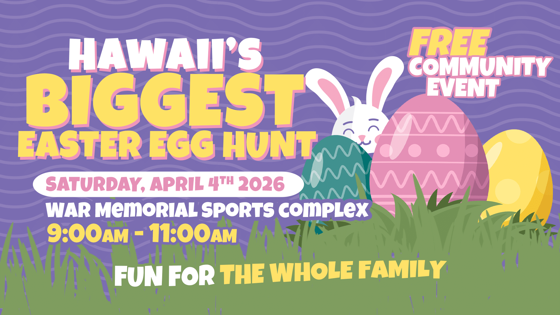 Join Hawaiʻi’s Biggest Easter Egg Hunt on Maui! Free family fun, bouncers, games, Easter show & egg hunt at War Memorial Sports Complex on April 4, 2026.